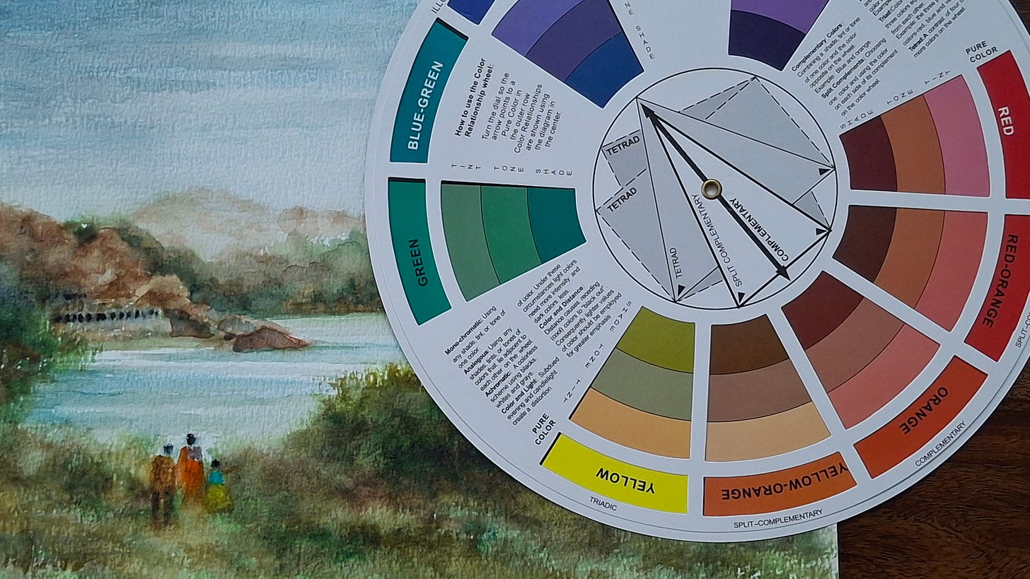 Watercolour as a medium thrives on transparency, light, and subtlety. The split-complementary colour scheme gives you: